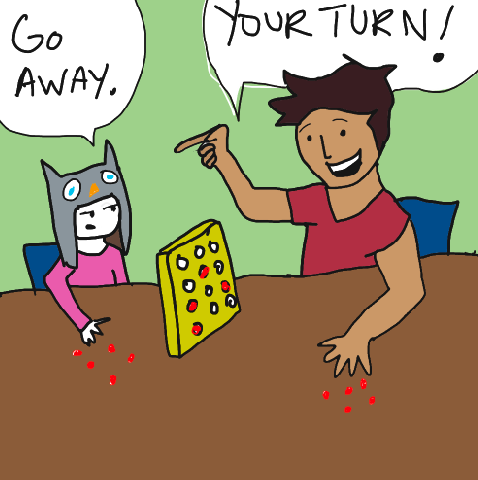 Then we played a stupid game, Connect Four. (Though not as stupid as the game I wrote about in my last post, Operation). I hated this the most because the sounds of the game were sudden and unpleasant. “This game is the pits,” I casually mentioned to Frank.