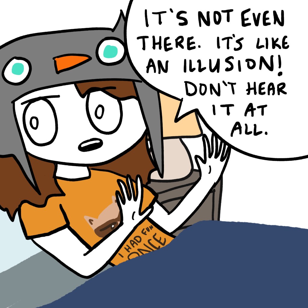 This is the scenario. Except my unfortunate soul, who can hear LITERALLY EVERYTHING, could not tune this out. I could not sleep until I put a stop to this madness. Cue me turning into an absolute werewolf and tearing apart my entire bedroom trying to find the source of the TINK.